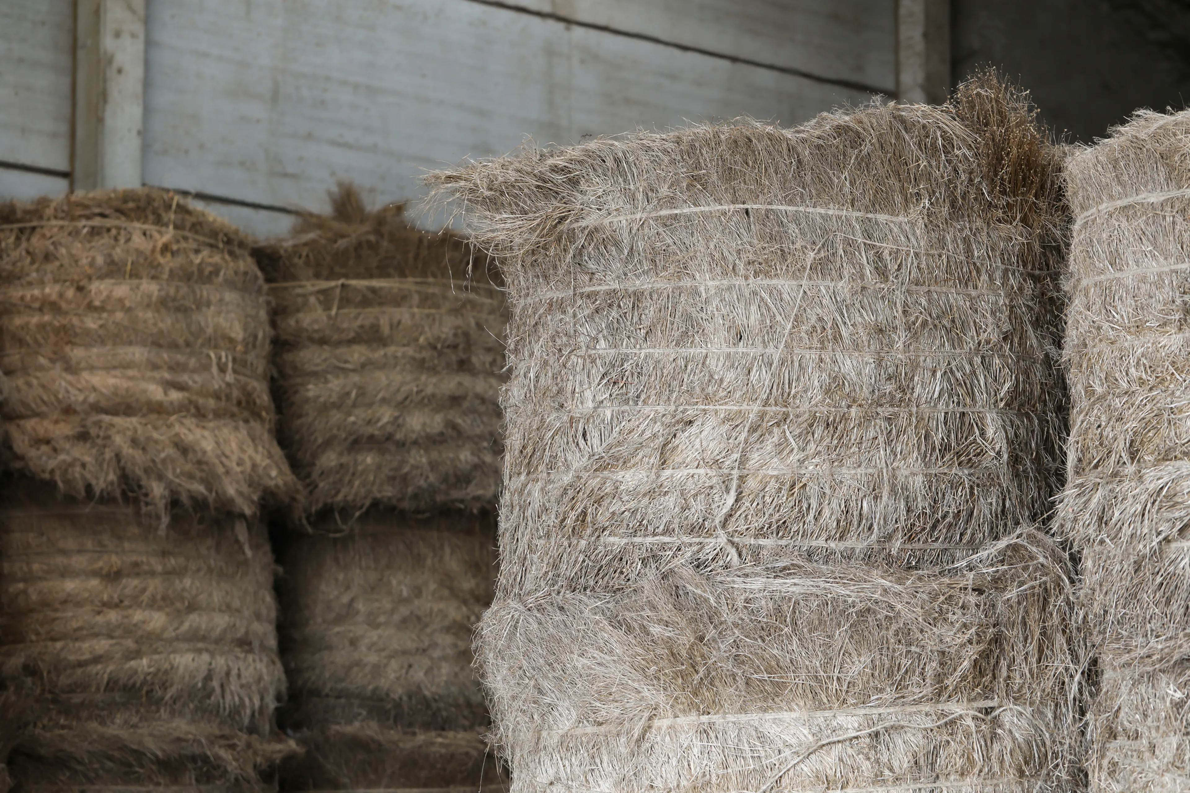 The flax plants are pulled from the ground, arranged in windrows in the fields for retting (combining the action of humidity and drying); then gathered into bales