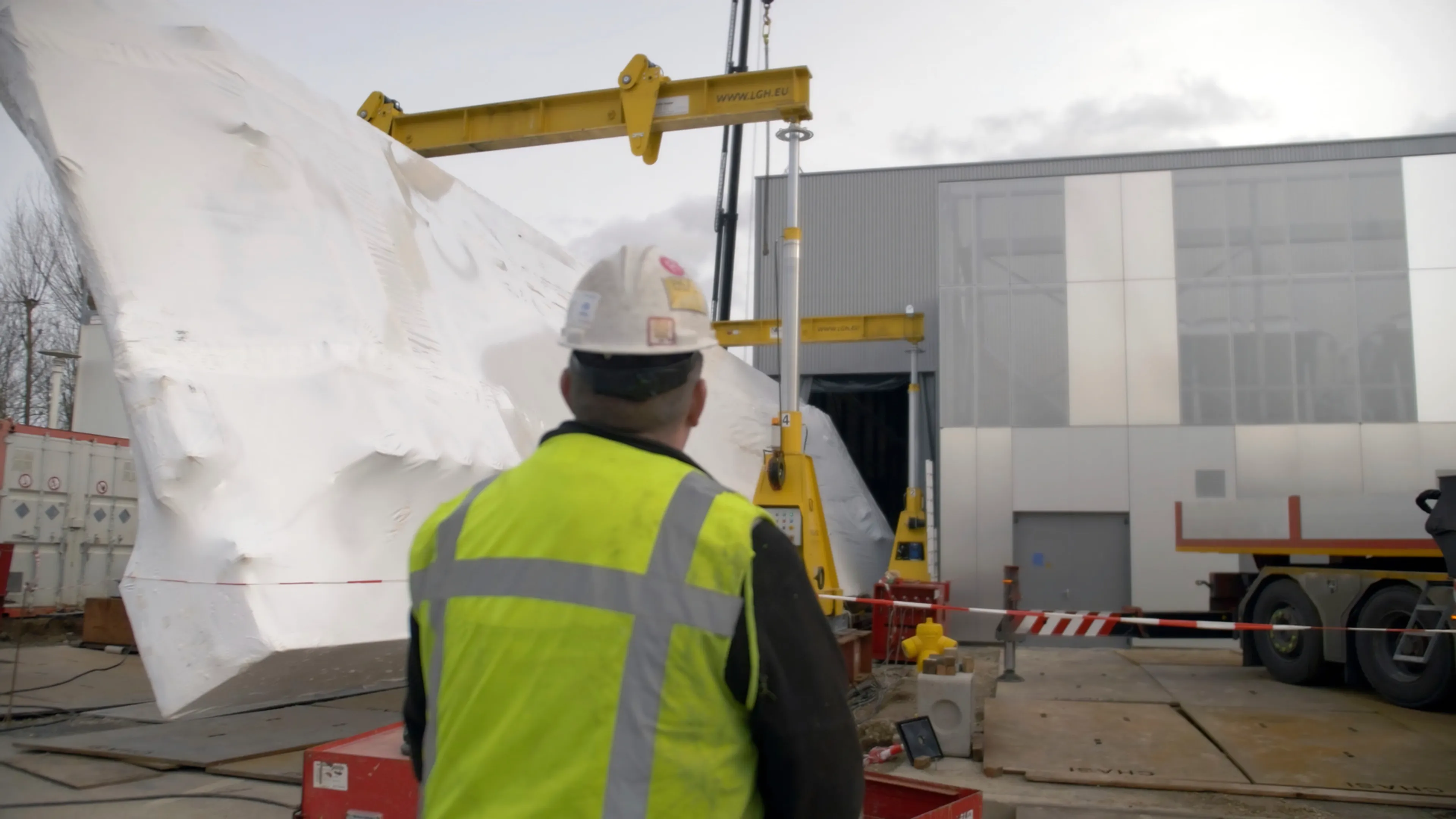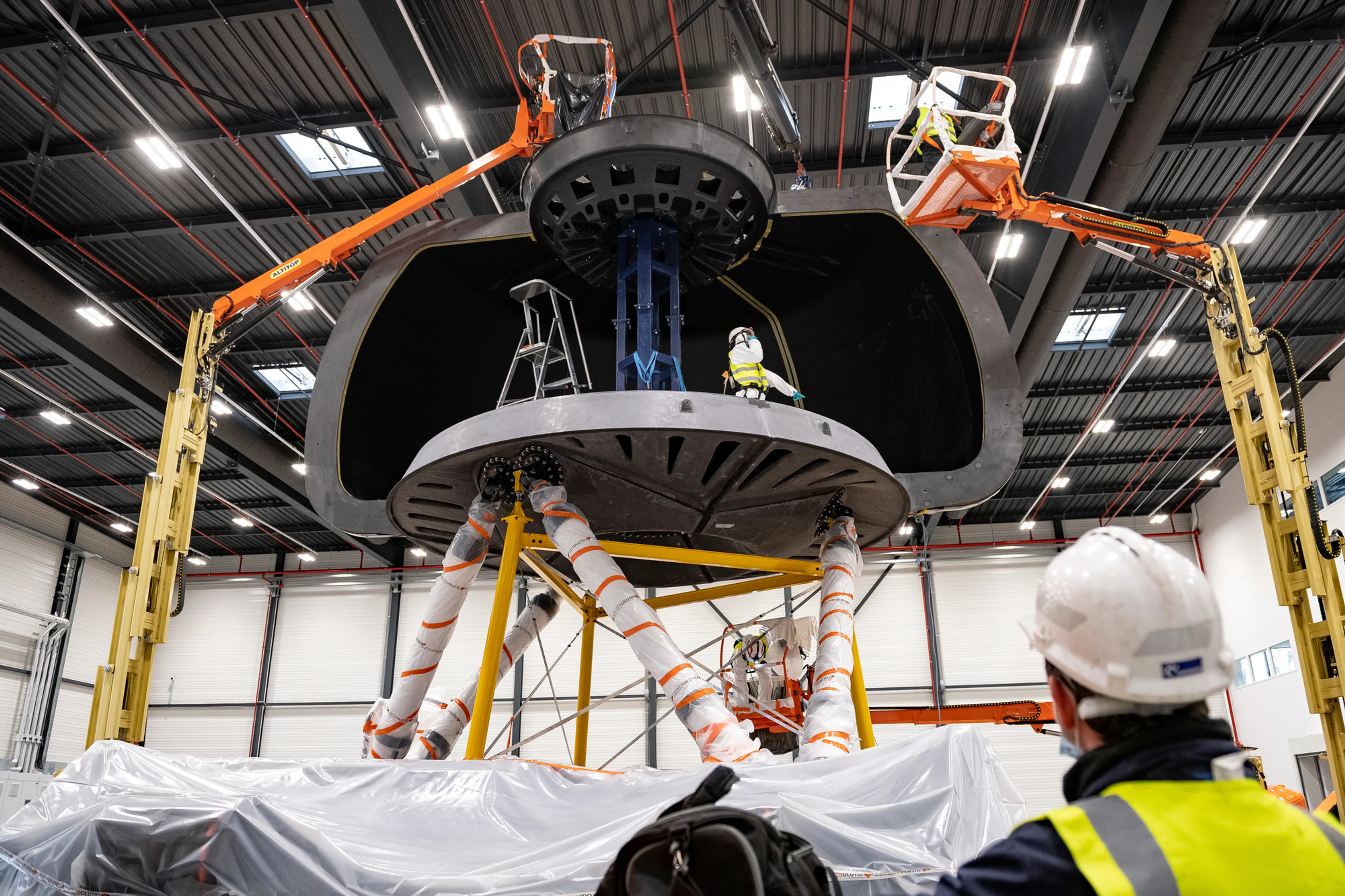 The last piece of the puzzle, the carbon fiber dome arrived in separate pieces since it would have been impossible to bring inside the building in a single piece. Its six petals, floor, and roof were then assembled, bolted, and glued together on site right in the simulation room.