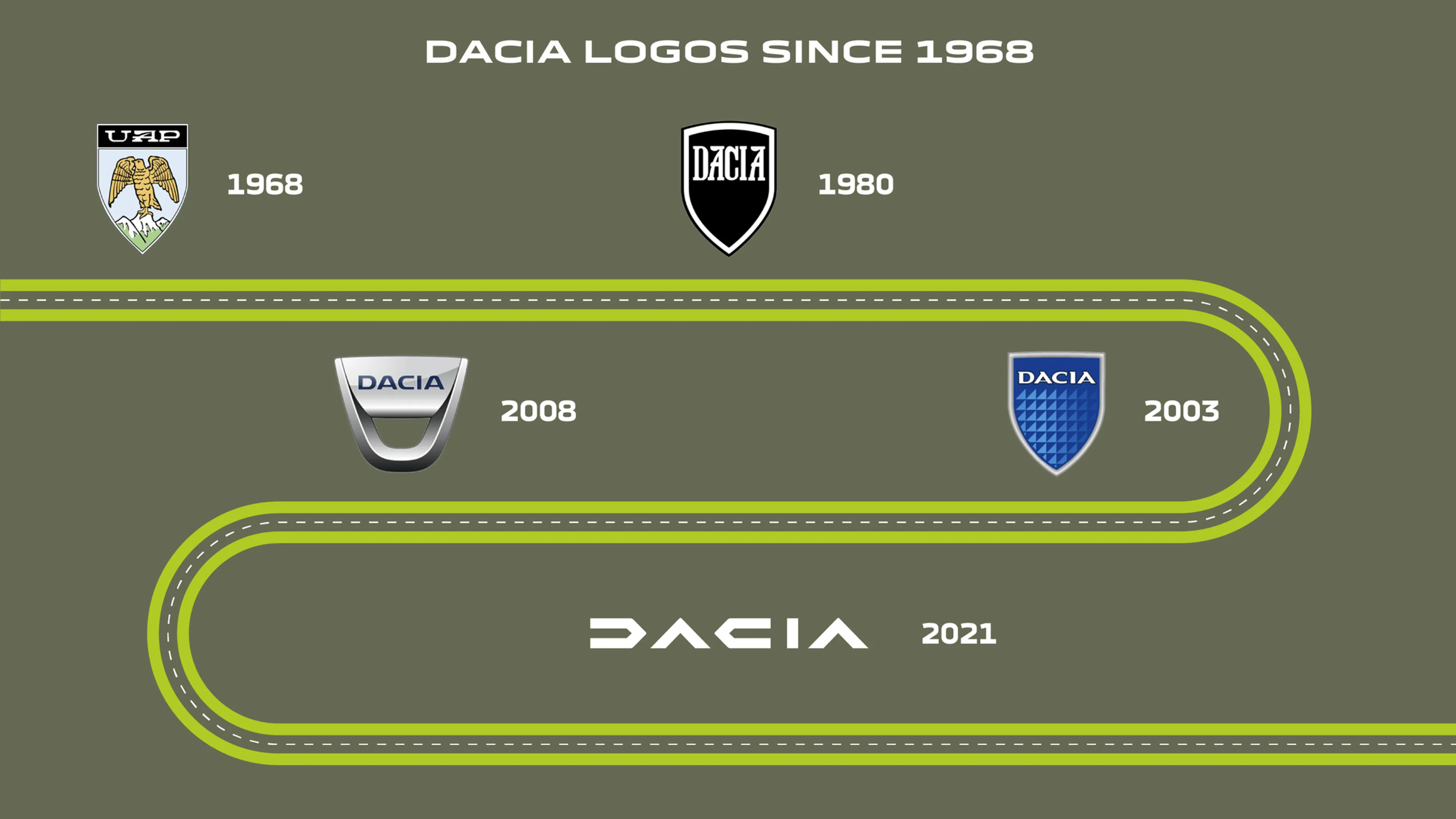 The first Dacia logo is full of local and national references. The mountain in the background pays tribute to Romania and the Carpathian Mountains in particular. In the centre, the eagle comes from the coat of arms of the Arges County, in the region of Muntenia where the UAP head office is based.